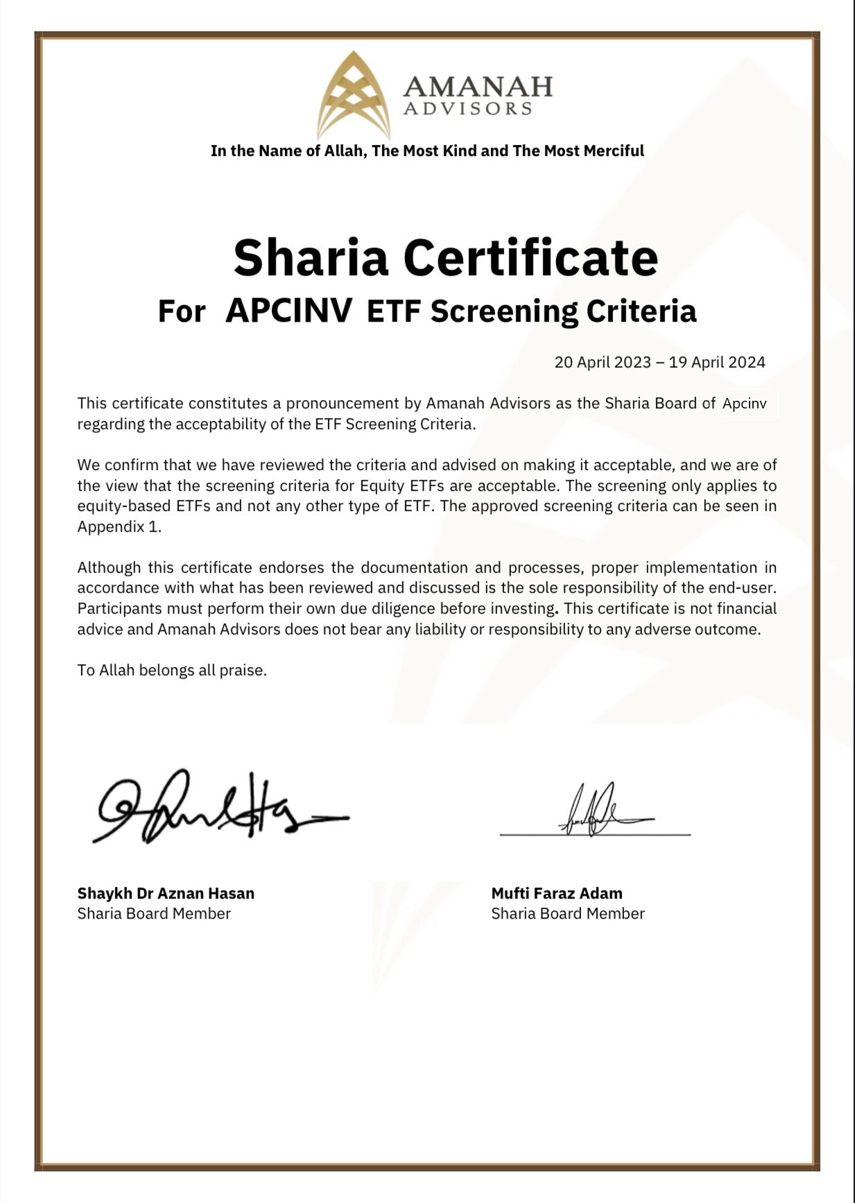 Our industry-leading Shariah board helps us maintain standards by AAOIF regarding impermissible revenue, interest-bearing debt, and interest-bearing securities.